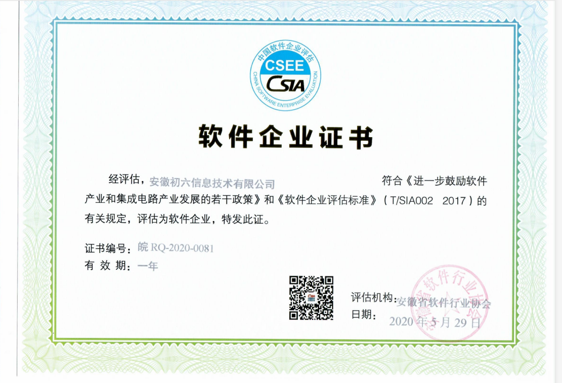 近日,安徽初六信息技术有限公司获得了由安徽省软件行业协会颁发的“软件企业证书”和“软件产品证书”,标志着公司正式获得软件企业资质及软件产品“双软企业”权威认证,表明公司的软件产品设计能力、软件产品质量及软件设计核心关键技术得到了行业认可。